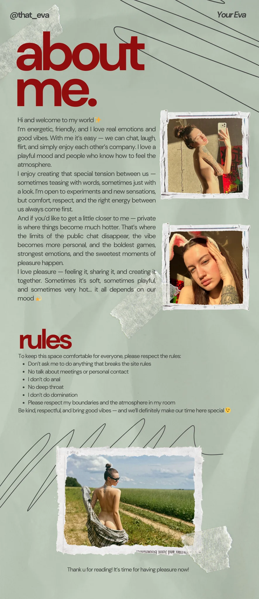 I love chatting, joking and flirting, creating an atmosphere that I want to return to again and again. I like to experiment and am open to new ideas — share your fantasies, and maybe we will realize them together.